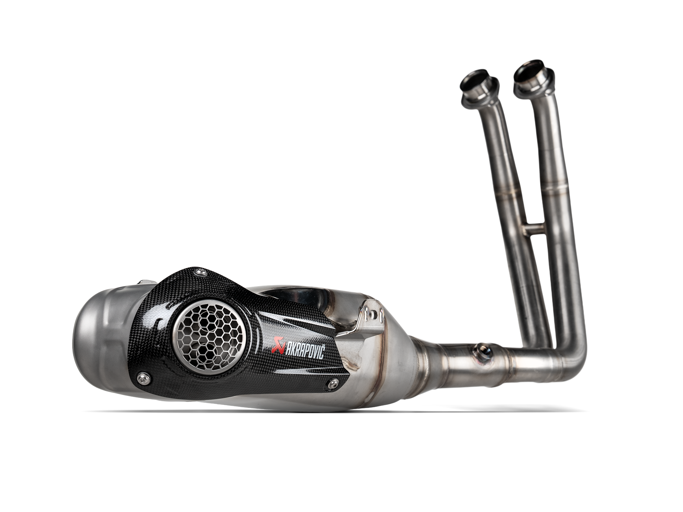 Inspired by the concept shown at EICMA in 2024, this exhaust has been designed to seamlessly integrate with the bike's lines. Constructed in one piece from high-grade stainless steel and shaped through the use of high-end technology, with the catalytic converter welded inside the muffler. It is finished with a handmade carbon-fibre cover, which incorporates the outlet with a honeycomb exhaust protection and an Akrapovič logo in red and white.