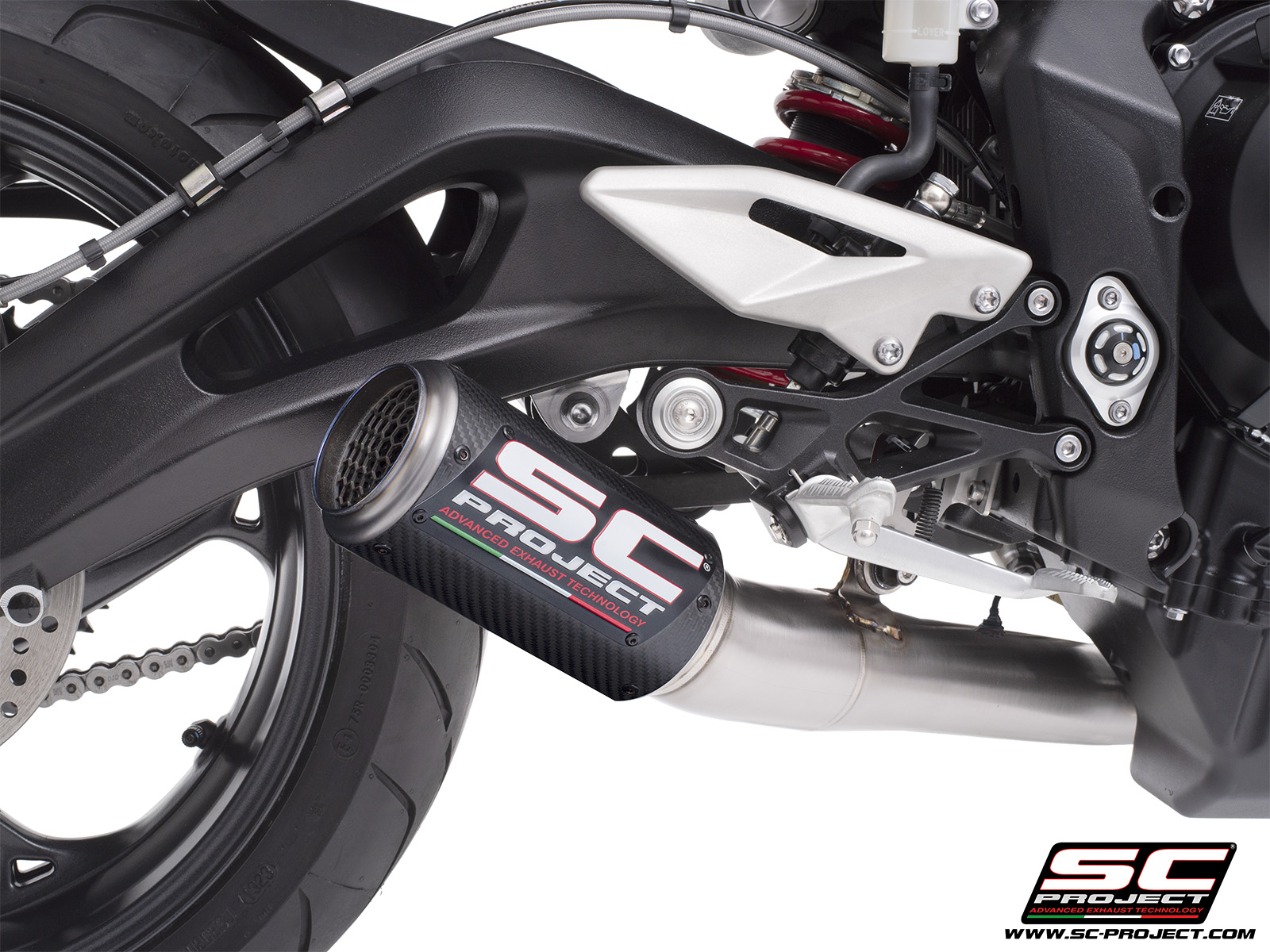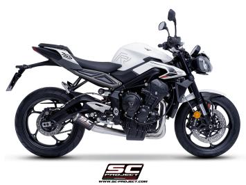 SC-Project Volledig 3-1 RVS Uitlaatsysteem Met CR-T Carbon With Stoneguard Grid Einddemper zonder E-keur TRIUMPH STREET TRIPLE 765 R / RS 2024 - 2025