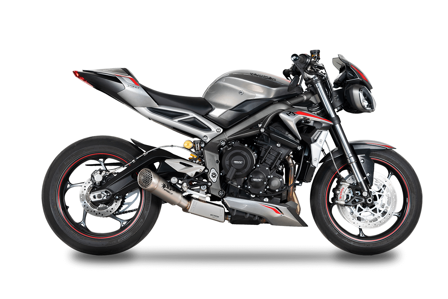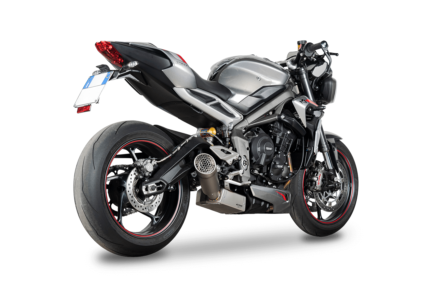 The first proposal recalls the successful Euro 4 previous version: the new box with catalytic converter is combined with an extremely aggressive low-mounting silencer. It is possible to choose exactly the same Grid-O silencer of the Moto2 World Champion 2020, full titanium, with visible tig welding (GTR0503) or the super aggressive MotoGp silencer (GTR0504), round and very short, available in titanium or dark style, with a large outlet diameter emphasizing the 3-cylinder sound.