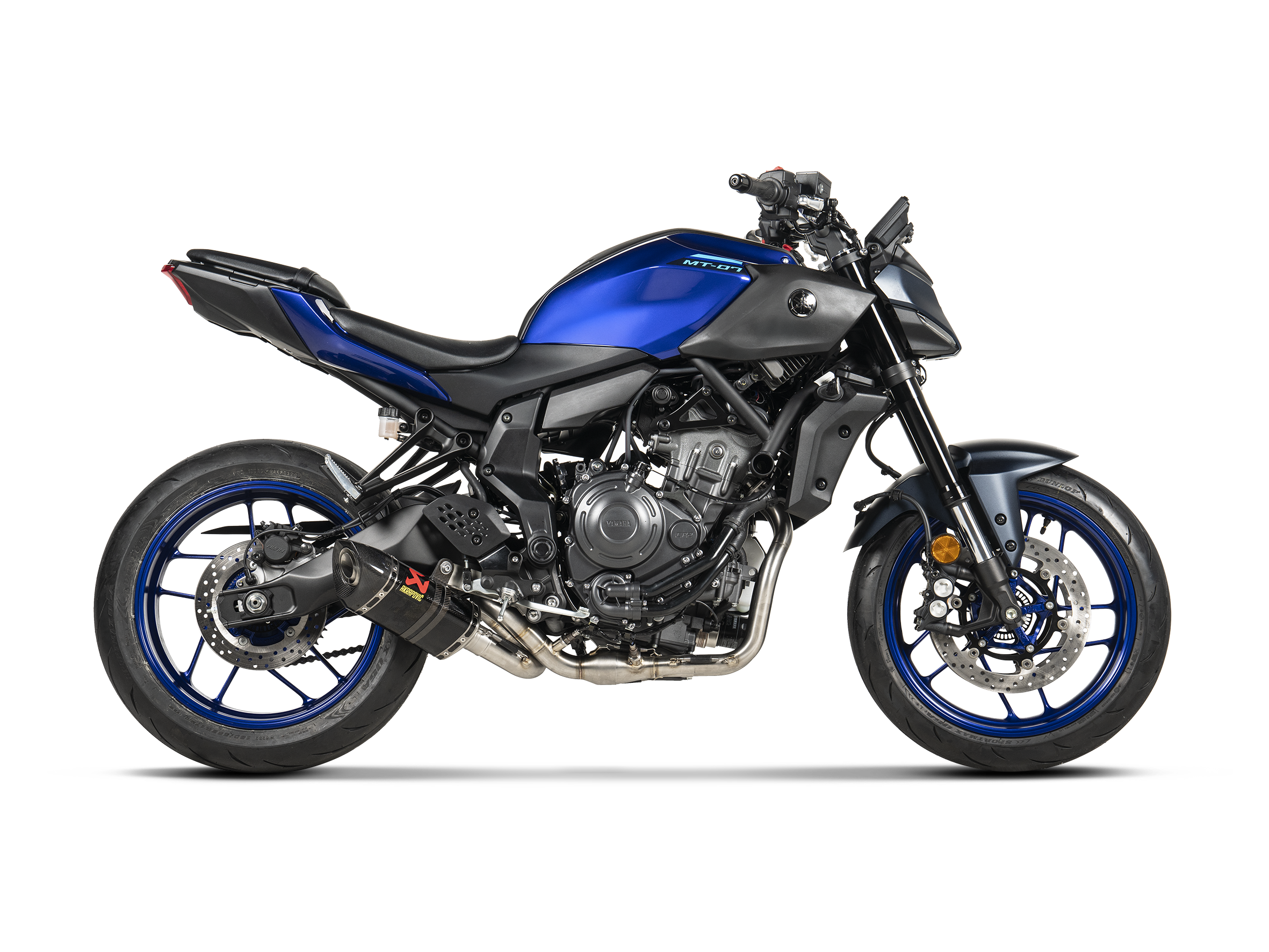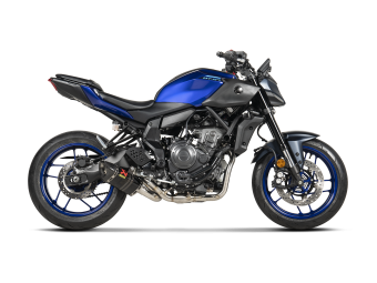 This exhaust has a lightweight carbon-fibre muffler outer sleeve, combined with stainless steel link pipes and headers and finished with a carbon-fibre end cap, to produce a system that is 3.0 kg (41,7%) lighter than stock. The new design features a shorter muffler for an enhanced sporty look, which exits on the side of the bike for visual impact. Power is increased by 1.9 kW (2.6 hp) at 9,100 rpm when compared in back-to-back tests on a MT-07 with a Racing Line (Carbon) exhaust and a standard stock exhaust system. The sporty racing sound is perfectly tuned to the engine. It is designed for use on tracks and closed-course competition circuits.