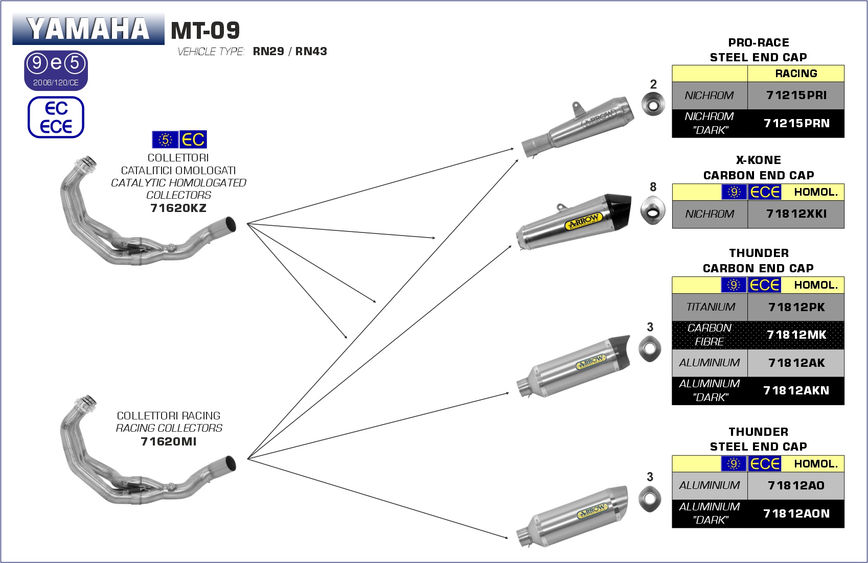 Arrow Volledig Uitlaatsysteem met Thunder Carbon Einddemper met E-keur en RVS Voorbochten incl. Katalysator Yamaha MT-09 2013 > 2020