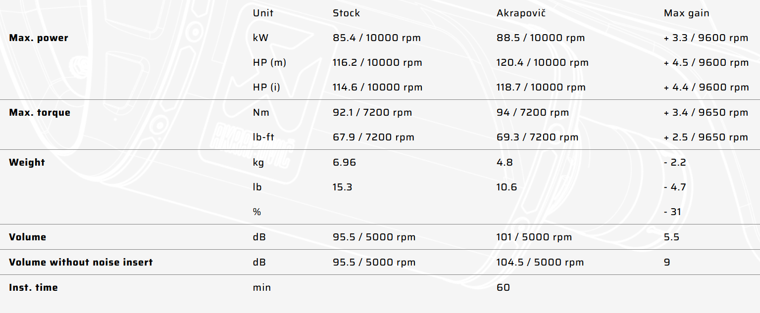 This exhaust has a lightweight carbon-fibre muffler outer sleeve and heatshield, combined with stainless steel link pipes and headers and finished with a titanium end cap, to produce a system that is 2.2 kg (31%) lighter than stock.