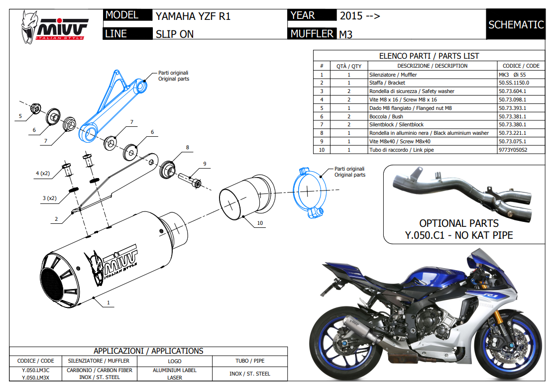 Mivv MK3 Carbon Einddemper met E-keur Yamaha YZF 1000 R1 2015 > 2022